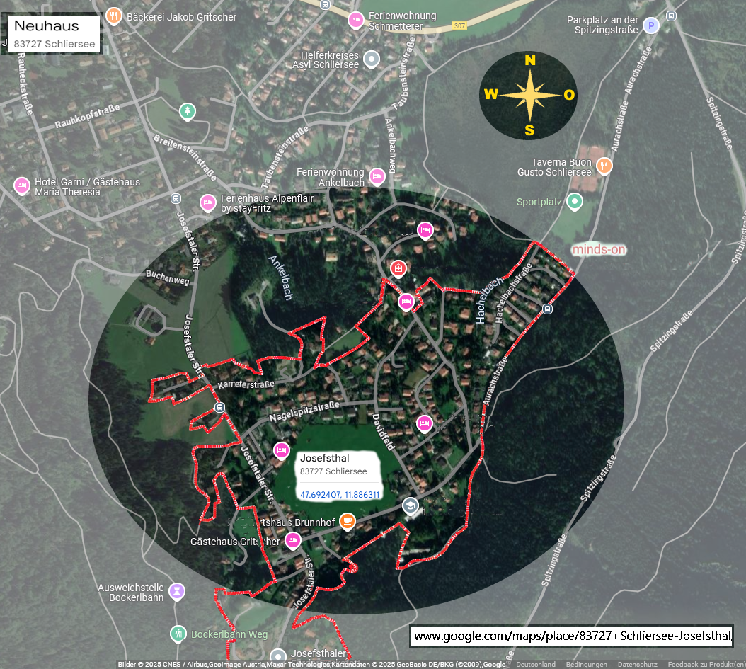 Diese einst Zugewanderten blieben jedenfalls dort weiter wohnen, als der Erzabbau schon längst eingestellt war. Sie ließen ihre eine Kuh das Gras auf benachbarten fischhausener Bauernwiesen fressen - ein wohl unvergessenes, aber verjährtes Eigenthumsdelikt ;-), das heutzutage auch mit Remigrationsphantasien nicht mehr zu sühnen ist. Doch „südlich vom Ankelbach“, ein Vorschlag zur Güte aus dem Jahr 1795, ist wohl für die meisten Bewohner und die Nachbarn in Neuhaus, Fischhausen und Schliersee auch heute noch eine akzeptabele Verortung. Ganz genau meint google.maps das zu wissen: